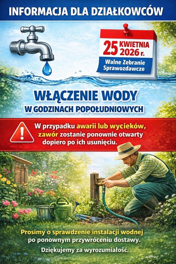 Uprzejmie informujemy, że w dniu 25 kwietnia 2026 r., w godzinach popołudniowych, po zakończeniu Walnego Zebrania Sprawozdawczego, nastąpi włączenie wody.